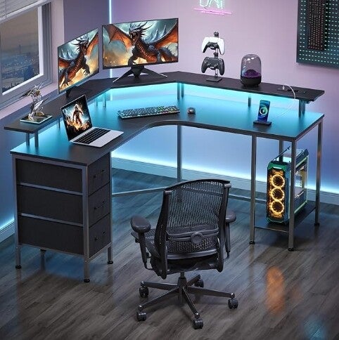 - 【Bureau gaming d'angle en L avec 3 tiroirs & support tour】Votre poste de commande ultime ! Ce bureau gaming d'angle en L intègre 3 tiroirs spacieux pour ranger manettes, accessoires gaming et câbles. Le support PC dédié optimise l'aération et protège votre unité centrale. Une organisation parfaite pour vos sessions marathon.